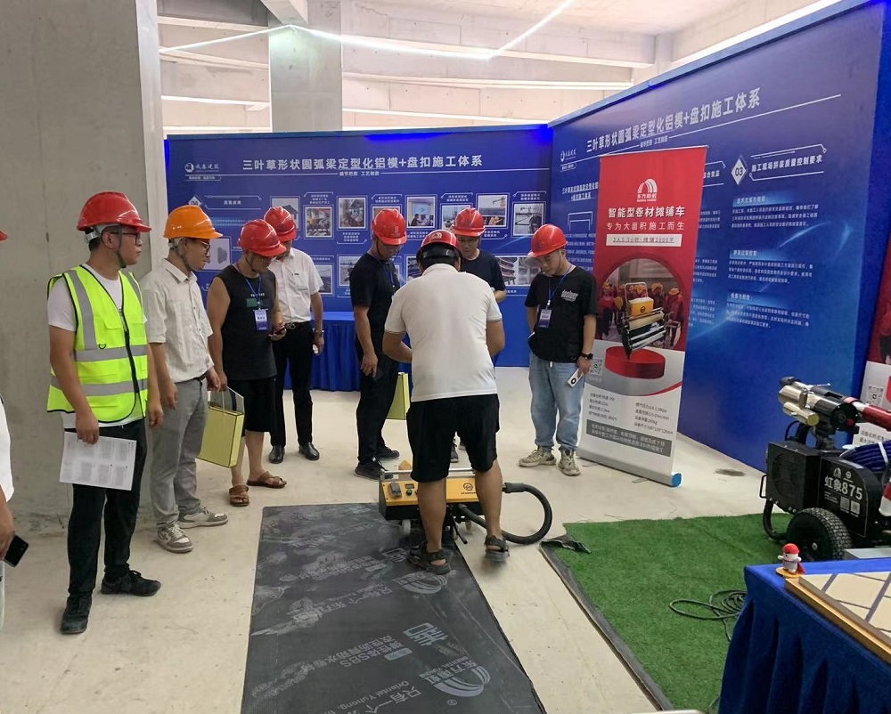 活動現場,東方雨虹技術人員詳細講解金屬屋面TPO等產品的性能優(yōu)勢、環(huán)保特性及應用場景,并將材料選擇、安全規(guī)范、施工工法等影響工程效果關鍵因素融于底板、側墻、頂板防水施工打樣展示。此外,通過操作智能卷材攤鋪機、聚氨酯噴涂機等設備,全方位呈現其功能與特性,讓現場觀眾近距離感受產品的獨特性。
